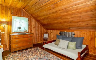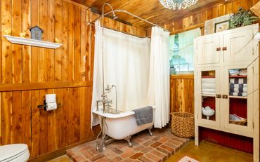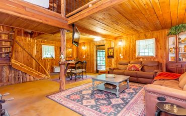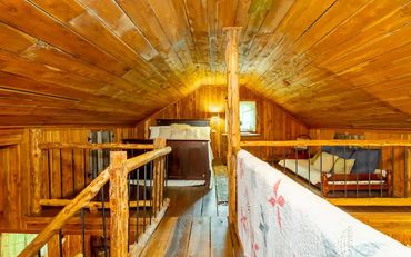This rustic loft style cedar cabin is situated on a gravel country road on beautiful Brashears Creek. Enjoy relaxing on the wrap around porch, soaking in the hot tub, and exploring the creek while you stay. Amazing views all around!